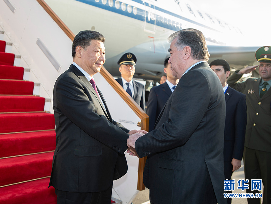當(dāng)?shù)貢r(shí)間晚6時(shí)許,習(xí)近平乘坐的專機(jī)抵達(dá)杜尚別國際機(jī)場(chǎng)。習(xí)近平步出艙門,受到塔吉克斯坦總統(tǒng)拉赫蒙熱情迎接。塔吉克斯坦女青年向習(xí)近平獻(xiàn)花。禮兵分列紅地毯兩側(cè)。