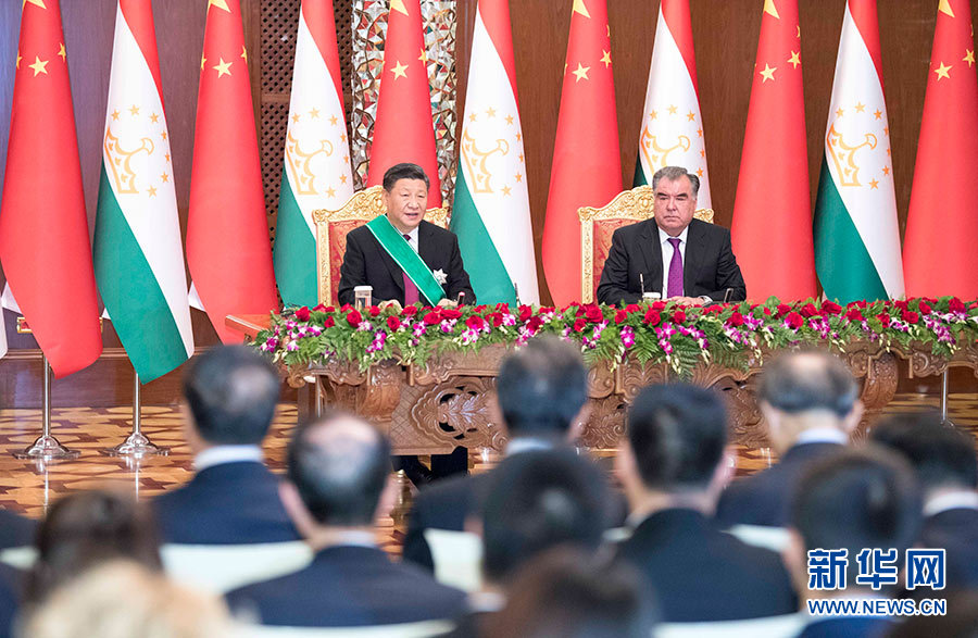 6月15日,國家主席習(xí)近平在杜尚別同塔吉克斯坦總統(tǒng)拉赫蒙會談。會談后,兩國元首簽署《中華人民共和國和塔吉克斯坦共和國關(guān)于進(jìn)一步深化全面戰(zhàn)略伙伴關(guān)系的聯(lián)合聲明》。 新華社記者 李學(xué)仁 攝
