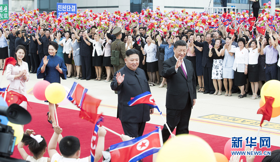 當(dāng)?shù)貢r(shí)間下午3時(shí)許,在朝鮮民眾夾道歡送中,習(xí)近平和彭麗媛抵達(dá)機(jī)場(chǎng),金正恩夫婦在下車處熱情迎接。朝鮮各界群眾在機(jī)場(chǎng)熱烈歡送,習(xí)近平向他們揮手致意。軍樂隊(duì)奏中朝兩國國歌,習(xí)近平在金正恩陪同下檢閱了朝鮮人民軍三軍儀仗隊(duì)。朝鮮少年兒童向習(xí)近平夫婦獻(xiàn)花。習(xí)近平同朝方前來送行的高級(jí)官員一一握手告別。在專機(jī)舷梯旁,習(xí)近平同金正恩緊緊握手話別。習(xí)近平夫婦邁上舷梯,在機(jī)艙門口轉(zhuǎn)身,向金正恩夫婦揮手告別。