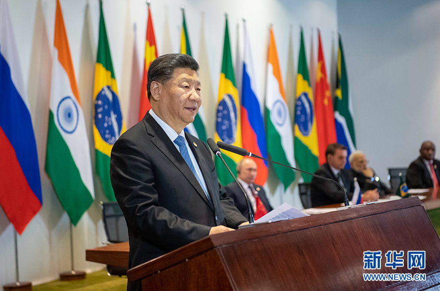 當(dāng)?shù)貢r(shí)間11月14日,金磚國(guó)家領(lǐng)導(dǎo)人同金磚國(guó)家工商理事會(huì)和新開(kāi)發(fā)銀行對(duì)話(huà)會(huì)在巴西利亞舉行。中國(guó)國(guó)家主席習(xí)近平、巴西總統(tǒng)博索納羅、俄羅斯總統(tǒng)普京、印度總理莫迪、南非總統(tǒng)拉馬福薩共同出席。這是習(xí)近平發(fā)表講話(huà)。 新華社記者 王曄 攝