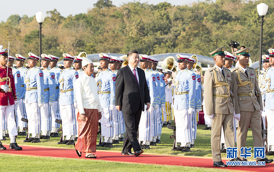 當(dāng)?shù)貢r(shí)間1月17日下午,國(guó)家主席習(xí)近平在內(nèi)比都總統(tǒng)府出席緬甸總統(tǒng)溫敏舉行的隆重歡迎儀式。 新華社記者 申宏 攝