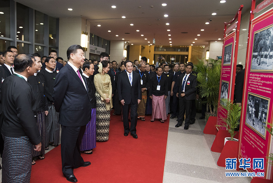 當?shù)貢r間1月17日晚,國家主席習近平在內(nèi)比都第二國際會議中心出席中緬建交70周年慶?;顒郁咧芯捨幕糜文陠觾x式。這是儀式開始前,習近平在緬方領(lǐng)導人陪同下,觀看慶祝中緬建交70周年圖片展。 新華社記者 黃敬文 攝