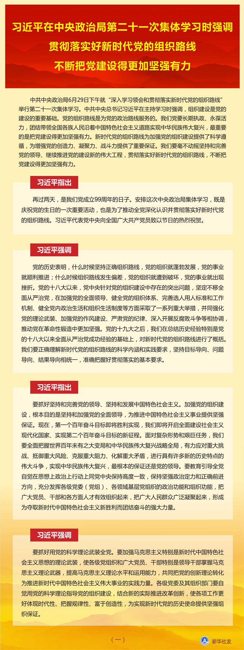新華社北京6月30日電 中共中央政治局6月29日下午就“深入學習領會和貫徹落實新時代黨的組織路線”舉行第二十一次集體學習。中共中央總書記習近平在主持學習時強調(diào),組織建設是黨的建設的重要基礎。黨的組織路線是為黨的政治路線服務的。我們黨要長期執(zhí)政、永葆活力,團結(jié)帶領全國各族人民沿著中國特色社會主義道路實現(xiàn)中華民族偉大復興,最重要的是把黨建設得更加堅強有力。新時代黨的組織路線為加強黨的組織建設提供了科學遵循,為增強黨的創(chuàng)造力、凝聚力、戰(zhàn)斗力提供了重要保證。我們要毫不動搖堅持和完善黨的領導、繼續(xù)推進黨的建設新的偉大工程,貫徹落實好新時代黨的組織路線,不斷把黨建設得更加堅強有力。