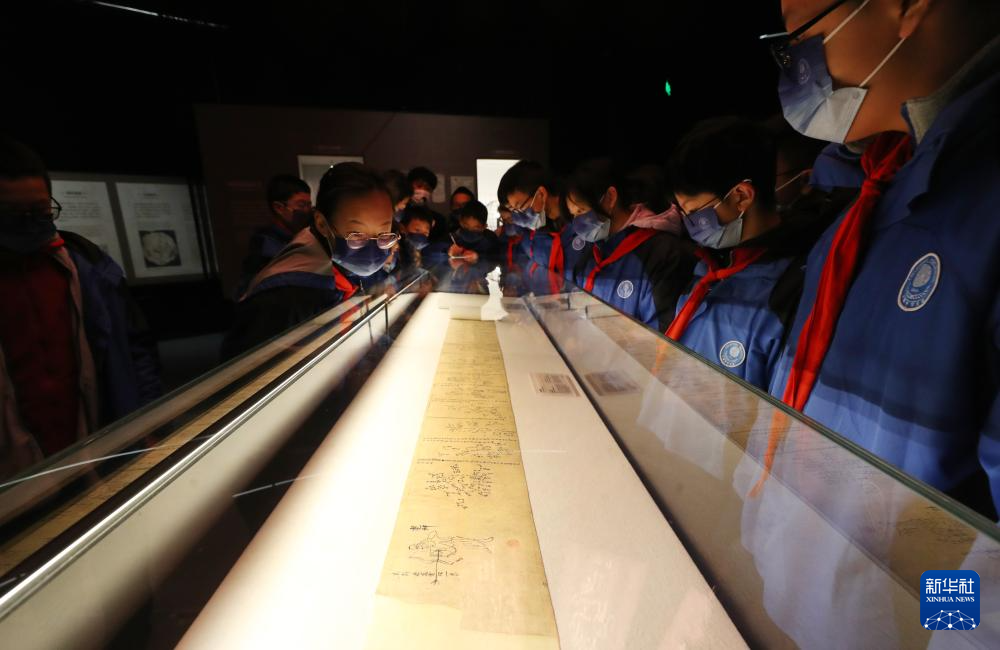 12月21日,前来参观的中学生在莫高窟藏经洞出土的唐代全天星图(复制品)展柜前驻足观看。
