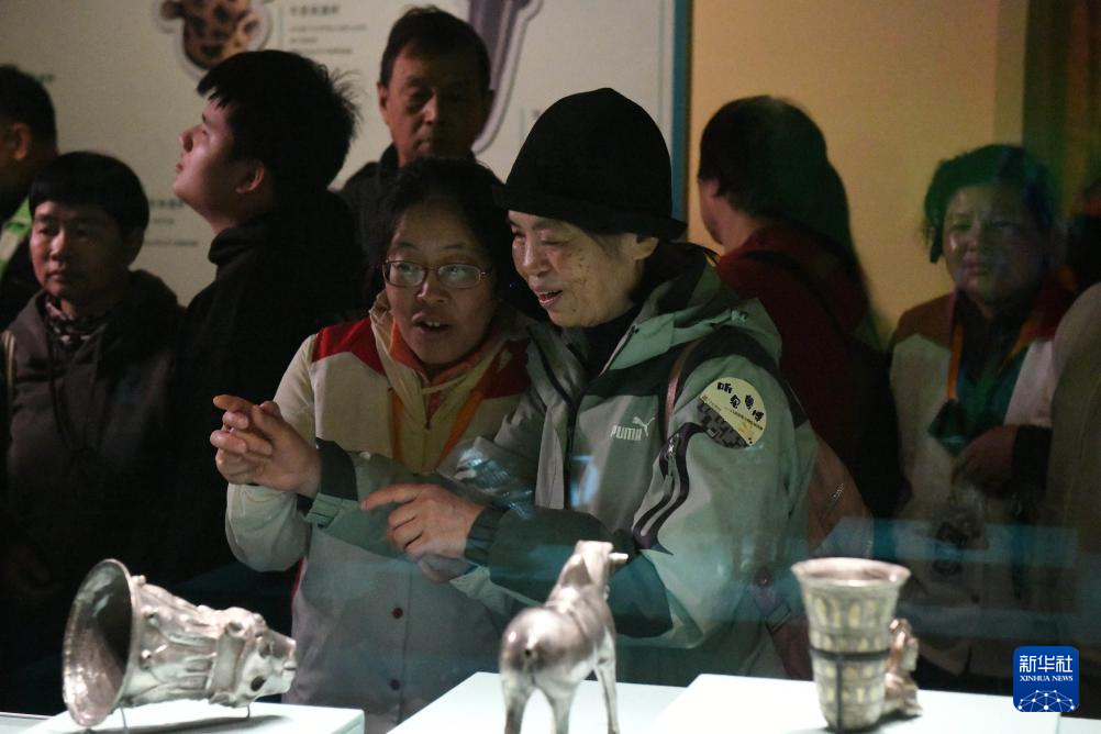 1月24日,视障观众在广东省博物馆志愿者的带领下参观“科威特王室珍藏展”。