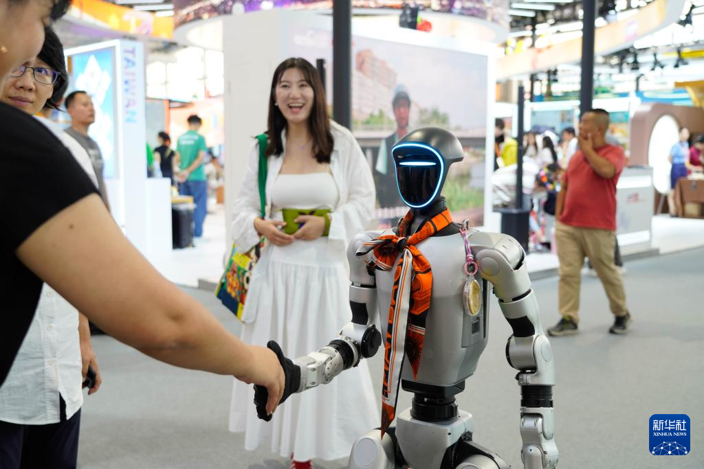 9月11日,在服贸会文旅服务专题展区,参观者在“海淀有礼文创机器人快闪店”与机器人互动。