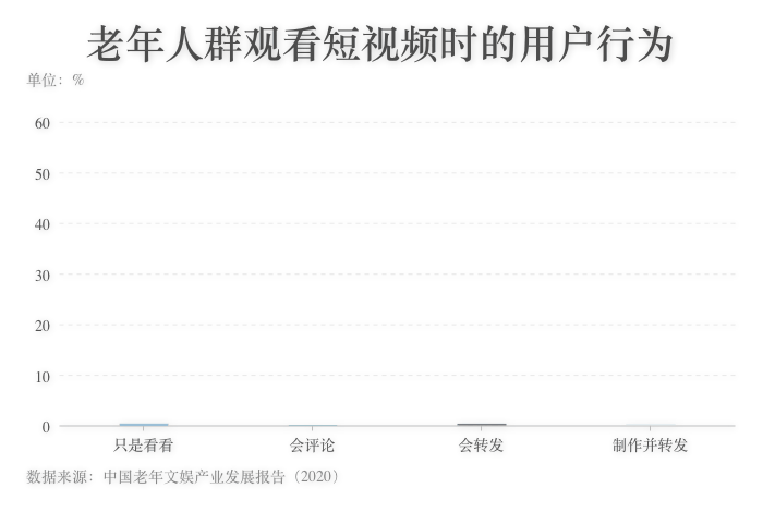 ???? ?總的來看,由于使用短視頻應(yīng)用的熟練程度、觀看短視頻的習(xí)慣等一些因素的影響,老年人群觀看短視頻的互動較少,但較愛轉(zhuǎn)發(fā)。從所有年齡段的用戶互動來看,82.8%的用戶有過不同形式的短視頻互動。其中,63.8%的用戶會轉(zhuǎn)發(fā)分享,65.5%的用戶會點(diǎn)贊、評論、收藏,不參與互動的用戶僅占13.2%。參與轉(zhuǎn)發(fā)分享的短視頻用戶當(dāng)中,20~39歲人群是主力軍,占比近60%,不參與互動的多為40歲以上的用戶。來自60加研究院的統(tǒng)計(jì)結(jié)果顯示,在參與互動的老年用戶中,會轉(zhuǎn)發(fā)的用戶占比達(dá)到53.8%,轉(zhuǎn)發(fā)是他們常有的互動行為。