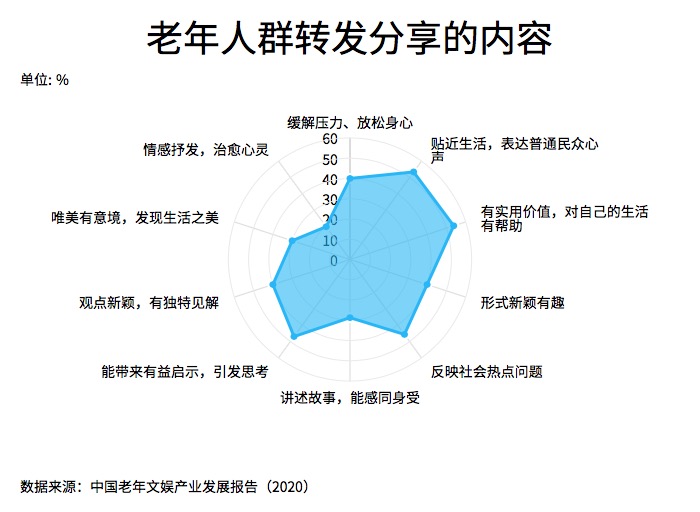 ???? ?中老年人群分享的內(nèi)容多是與實(shí)際生活密切相關(guān),而且有價(jià)值的。“有實(shí)用價(jià)值,對自己的生活有幫助”的內(nèi)容占53.8%,“貼近生活,表達(dá)普通民眾心聲”的內(nèi)容占53.4%,“能帶來有益啟示,引發(fā)思考”的內(nèi)容占47.2%,“反映社會熱點(diǎn)問題”的內(nèi)容占45.7%。