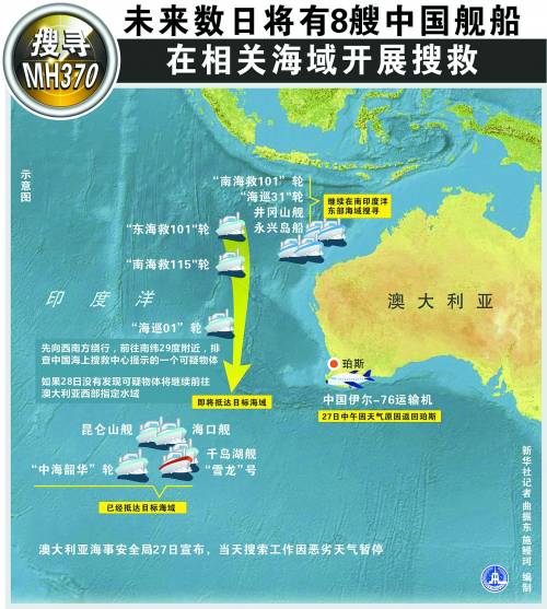 目前,馬航失聯(lián)客機(jī)搜救工作已進(jìn)入第三階段。按照“明確方向、增加力量、連續(xù)作戰(zhàn)、整體推進(jìn)”的部署,中國(guó)海上搜救中心進(jìn)一步優(yōu)化了后續(xù)搜尋方案。我方現(xiàn)在有12艘艦船、8架艦載直升機(jī)、3架固定翼飛機(jī)已經(jīng)到達(dá)或者正在趕往南印度洋海域開展搜尋,我國(guó)已成為水面搜救主力,當(dāng)前的主要任務(wù)是搜尋與失聯(lián)飛機(jī)有關(guān)的所有可疑物體。