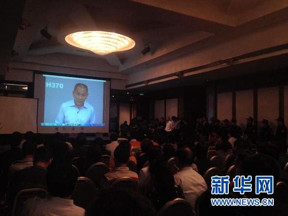 5月1日,在北京麗都維景酒店,乘客家屬在收看馬來(lái)西亞航空公司首席執(zhí)行官葉海亞發(fā)表聲明的視頻連線(xiàn)。 新華社記者 沈伯韓 攝