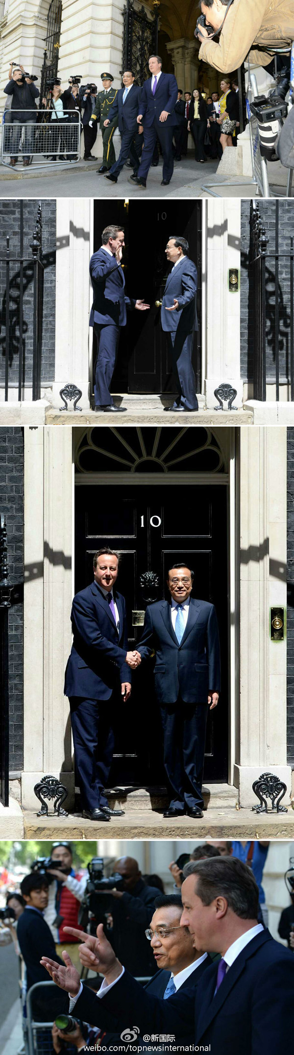 新華網(wǎng)北京6月17日電 據(jù)新華社“新國(guó)際”微博報(bào)道,17日,英國(guó)首相府所在的唐寧街附近五星紅旗飄揚(yáng),卡梅倫為到訪的李克強(qiáng)總理舉行隆重歡迎儀式。隨后,兩位領(lǐng)導(dǎo)人步行來(lái)到首相官邸。面對(duì)中外記者的鏡頭,李克強(qiáng)與卡梅倫握手合影,愉快交談。在首相府一層內(nèi)閣會(huì)議室內(nèi),兩位領(lǐng)導(dǎo)人就雙邊關(guān)系和共同關(guān)心的問(wèn)題舉行會(huì)談。