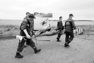 19日,在烏克蘭頓涅茨克州的MH17航班墜機(jī)現(xiàn)場,救援人員搬運遇難者遺體圖/新華社