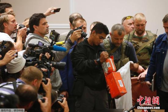 當(dāng)?shù)貢r間2014年7月22日,頓涅茨克,“頓涅茨克人民共和國”官員向馬來西亞調(diào)查人員移交馬航MH17航班客機黑匣子。