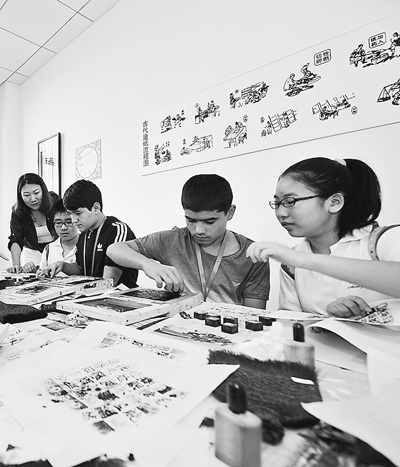 2014年8月14日,上合組織成員國首批中學生交流夏令營來到天津。圖為來自塔吉克斯坦的中學生與中國學生一起體驗活字印刷術。