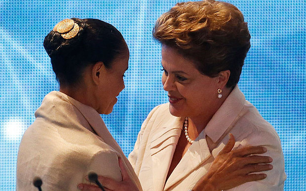 ????其實,席爾瓦的政治生涯也極具戲劇性并充滿意外。起先參與政治活動的她,后來又成了一名環(huán)境保護主義者;在擔(dān)任多年的國會議員后,她于2003年在盧拉政府中出任環(huán)境部長。2009年8月前,席爾瓦與羅塞夫同屬勞工黨;2010年,席爾瓦代表綠黨參選總統(tǒng)并落選。在今年的巴西總統(tǒng)選舉中,加入社會黨的席爾瓦本來是作為副總統(tǒng)競選人陪伴坎波斯,但由于坎波斯在8月份墜機身亡,席爾瓦在黨內(nèi)被選為總統(tǒng)競選人。