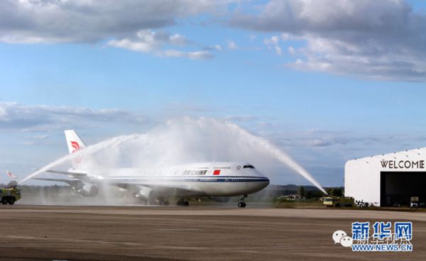 ???? ?11月21日,國家主席習(xí)近平抵達楠迪,開始對斐濟進行國事訪問并將同太平洋建交島國領(lǐng)導(dǎo)人舉行會晤。圖為習(xí)近平乘坐的專機在楠迪國際機場跑道上滑行穿過“水門”,這是當(dāng)?shù)亟o予最尊貴客人的禮遇,表達為客人“洗塵”。 新華社記者 丁林 攝