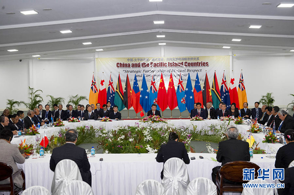 ???? 11月22日,國家主席習(xí)近平在楠迪同斐濟(jì)總理姆拜尼馬拉馬、密克羅尼西亞聯(lián)邦總統(tǒng)莫里、薩摩亞總理圖伊拉埃帕、巴布亞新幾內(nèi)亞總理奧尼爾、瓦努阿圖總理納圖曼、庫克群島總理普納、湯加首相圖伊瓦卡諾、紐??偫硭忍窖髰u國領(lǐng)導(dǎo)人舉行集體會晤。習(xí)近平主持會議并發(fā)表主旨講話。新華社記者 饒愛民攝