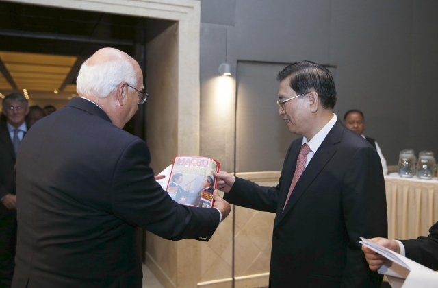 ??? 希門(mén)內(nèi)斯將最新一期《宏觀(guān)經(jīng)濟(jì)》送給張德江委員長(zhǎng)。1972年希門(mén)內(nèi)斯首次訪(fǎng)華,是時(shí)任墨西哥總統(tǒng)埃切維里亞的新聞官。他后來(lái)多次到中國(guó)參觀(guān)考察,親眼目睹了中國(guó)的巨大變化。他說(shuō)原來(lái)的北京是個(gè)“矮城”,樓不高,車(chē)輛少,步行的人多?,F(xiàn)在的北京“已成為高樓林立的現(xiàn)代化大都市”。