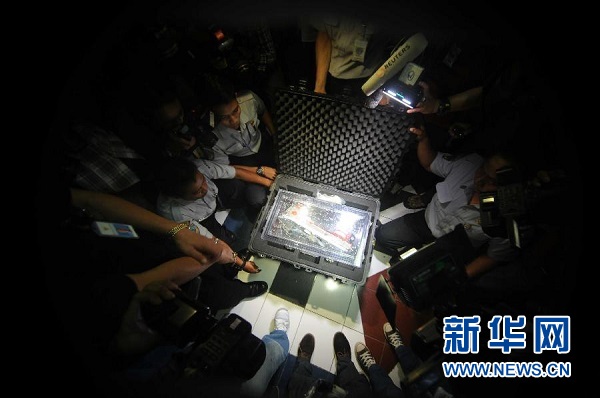 ??? 1月12日,在印度尼西亞雅加達(dá),工作人員打開(kāi)裝有亞航失事客機(jī)黑匣子的箱子。印度尼西亞國(guó)家交通安全委員會(huì)主席塔唐·庫(kù)爾尼亞迪12日說(shuō),搜救人員當(dāng)天早上打撈起的失事亞航客機(jī)其中一個(gè)黑匣子——飛行數(shù)據(jù)記錄器狀態(tài)良好。新華社發(fā)(阿貢攝)