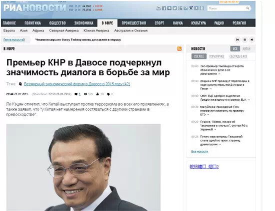 俄新社21日以《中國總理強(qiáng)調(diào)以對話促進(jìn)和平的重要性》為題報(bào)道了李克強(qiáng)總理在達(dá)沃斯論壇上的致辭。報(bào)道中援引了李克強(qiáng)“世界各國都要像愛護(hù)自己的眼睛一樣愛護(hù)和平”的說法,并指出,中國反對一切形式的恐怖主義。文章寫道,今年是世界反法西斯戰(zhàn)爭勝利70周年,李克強(qiáng)強(qiáng)調(diào)了維護(hù)戰(zhàn)后國際秩序的重要性。
