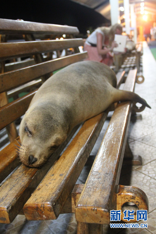 一只海獅睡在圣克魯斯(Santa Cruz)島碼頭的長(zhǎng)椅上。