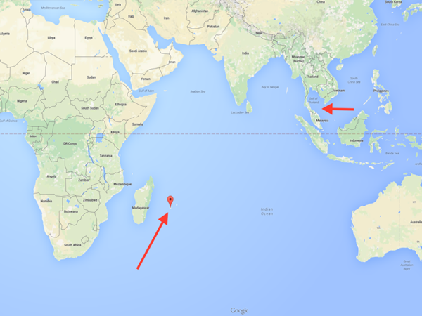 ?。ㄗ髠?cè)箭頭是殘骸發(fā)現(xiàn)地,右側(cè)為MH370最后信號(hào)的發(fā)出地)