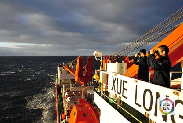 3月28日,“雪龍”號科考船的工作人員手持望遠(yuǎn)鏡觀察海上情況。(新華社記者張建松攝)