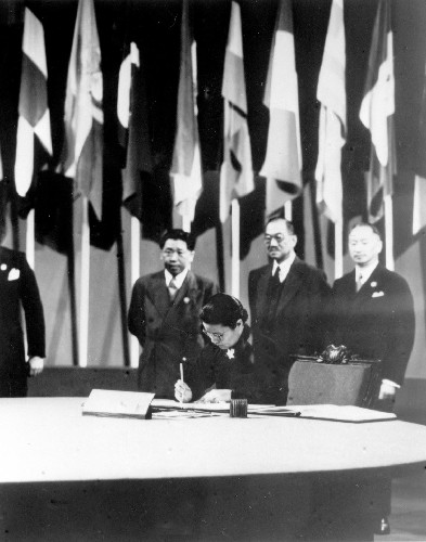 ??? 1945年10月24日,《聯(lián)合國憲章》經安全理事會的5個常任理事國以及其他簽字國過半數(shù)批準,開始正式生效。聯(lián)合國作為第二次世界大戰(zhàn)之后最大的國際性組織正式成立。此后,這一天被定為聯(lián)合國日。圖為中國代表團成員吳貽芳(前)在憲章上簽字。 新華社發(fā)