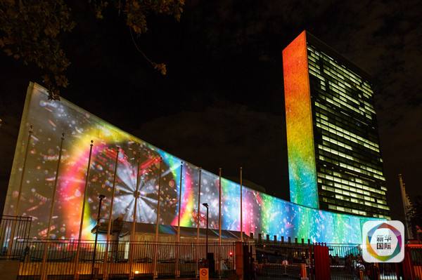 ↑9月22日,聯(lián)合國總部大樓外投影顯示可持續(xù)發(fā)展目標(biāo)宣傳畫面。(新華社記者李木子攝)