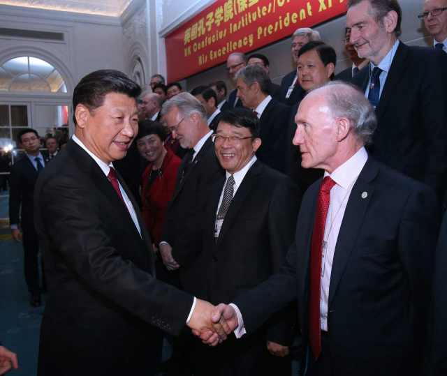 習(xí)近平指出,近年來,孔子學(xué)院在英國快速發(fā)展。目前,英國已經(jīng)建立起29所孔子學(xué)院和126個孔子課堂,數(shù)量居歐洲之首。全英孔子學(xué)院取得的碩果也是中英人文交流蓬勃發(fā)展的縮影。通過人文交流,中英兩國文化中的精華正在對兩國人民的思維方式和生活方式產(chǎn)生著奇妙的“化學(xué)反應(yīng)”?!盀橹粎?,誨人不倦?!毕M谧魑唤處熢俳釉賲?,為中英友好事業(yè)添磚加瓦。希望孔子學(xué)院繼續(xù)秉承“相互尊重、友好協(xié)商、平等互利”的校訓(xùn),為傳播文化、溝通心靈、促進(jìn)世界文明多樣性作出新的更大貢獻(xiàn)。