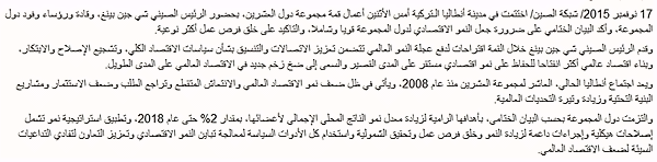 昨日,二十國集團領導人第十次峰會在土耳其安塔利亞閉幕。中國領導人習近平期間出席了峰會,并發(fā)表題為《創(chuàng)新增長路徑 共享發(fā)展成果》的重要講話,其中強調二十國集團要加強宏觀經濟政策溝通和協(xié)調,推動改革創(chuàng)新,構建開放型世界經濟。