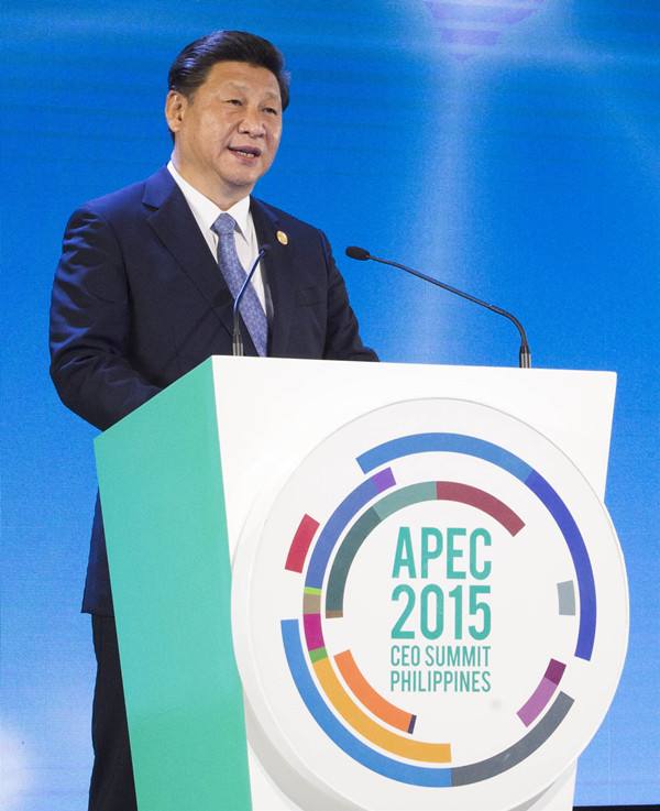 2015年11月18日,國家主席習近平在菲律賓馬尼拉出席亞太經(jīng)合組織工商領(lǐng)導(dǎo)人峰會并發(fā)表主旨演講。