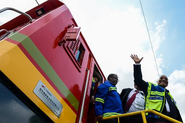 2015年3月19日,南非總統(tǒng)祖馬(右)從“曼德拉一型” 第95臺(tái)電力機(jī)車上走下來(lái)時(shí)向大家揮手致意。(新華社記者翟健嵐攝)