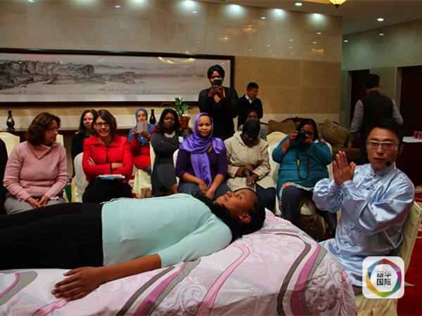 圖為中國援納米比亞醫(yī)療隊(duì)成員王鵬(前右)演示按摩手法。(新華社記者吳長(zhǎng)偉攝)