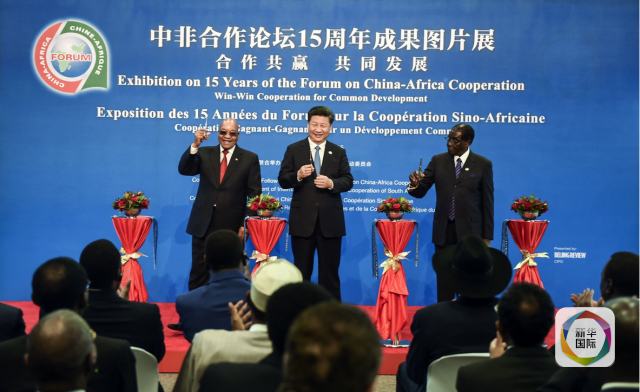 12月4日,國家主席習(xí)近平在約翰內(nèi)斯堡出席中非合作論壇15周年成果圖片展開幕式,同南非總統(tǒng)祖馬,非盟輪值主席、津巴布韋總統(tǒng)穆加貝一道為展覽剪彩。(新華社記者謝環(huán)馳攝)