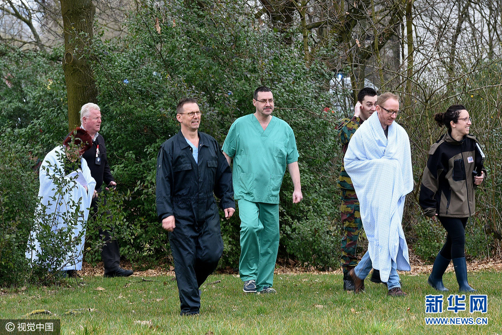 ??? 當?shù)貢r間2016年3月24日,比利時布魯塞爾, Koningin Astrid-Reine Astrid 軍事醫(yī)院發(fā)生天然氣泄漏,民眾緊急疏散,一部分在日前布魯塞爾恐襲中受傷的民眾在此接受治療。圖片來源:視覺中國