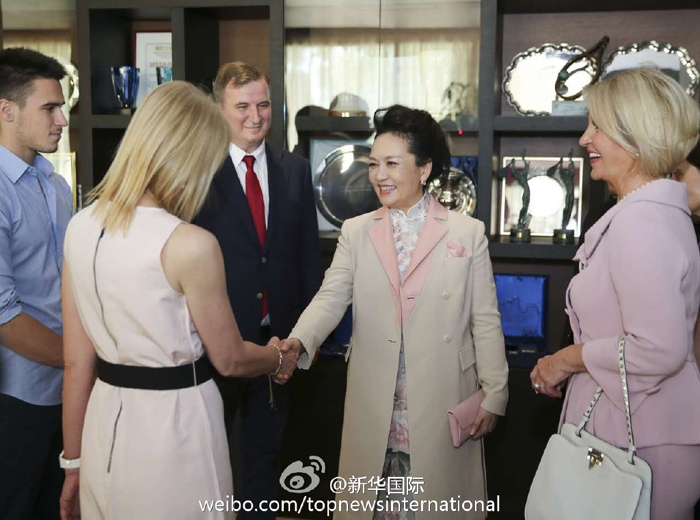 ??? 新華網(wǎng)北京6月18日電 18日中午,彭麗媛在塞爾維亞總統(tǒng)夫人德拉吉察陪同下,參觀了德約科維奇網(wǎng)球培訓中心,并同塞爾維亞著名網(wǎng)球運動員德約科維奇的母親、叔父和弟弟親切會面。彭麗媛對德約科維奇家人說:“小德在中國擁有很多粉絲?!迸睇愭路Q贊德約科維奇不僅球技精湛而且充滿愛國情懷。彭麗媛還向網(wǎng)球培訓中心贈送德約科維奇自傳《一發(fā)制勝》的中文版。?(新華社新華國際微博報道)