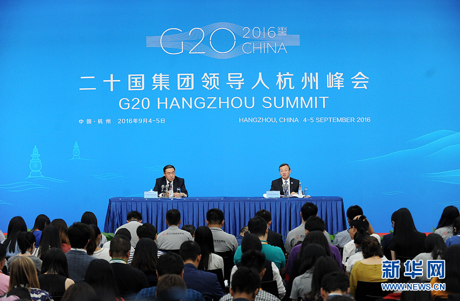 9月3日,中國代表團(tuán)在浙江杭州舉行新聞發(fā)布會,商務(wù)部副部長王受文就G20杭州峰會經(jīng)貿(mào)成果展望向記者介紹情況并回答提問。新華網(wǎng)記者?陳競超 攝