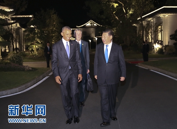 9月3日晚,國家主席習近平在杭州西湖國賓館與前來出席二十國集團領導人杭州峰會的美國總統(tǒng)奧巴馬交談。 新華社記者 蘭紅光 攝