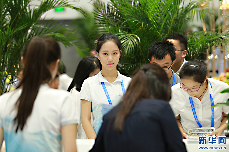 ????“小青荷”是此次峰會志愿者的代名詞。這個名字取自宋代詩人楊萬里描寫杭州的詩句“接天蓮葉無窮碧,映日荷花別樣紅”,“青荷”也音同“親和”,他們成了G20杭州峰會新聞中心里一道亮麗的風景。新華網(wǎng) 祝立銘 攝