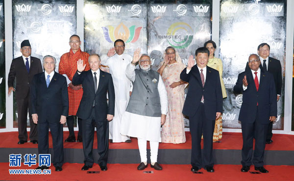 10月16日,金磚國(guó)家領(lǐng)導(dǎo)人同“環(huán)孟加拉灣多領(lǐng)域經(jīng)濟(jì)技術(shù)合作倡議”成員國(guó)領(lǐng)導(dǎo)人對(duì)話會(huì)在印度果阿舉行。國(guó)家主席習(xí)近平同印度總理莫迪、南非總統(tǒng)祖馬、巴西總統(tǒng)特梅爾、俄羅斯總統(tǒng)普京以及斯里蘭卡總統(tǒng)西里塞納、孟加拉國(guó)總理哈西娜、不丹首相托杰、尼泊爾總理普拉昌達(dá)、緬甸國(guó)務(wù)資政昂山素季、泰國(guó)政府代表等共同出席。這是與會(huì)領(lǐng)導(dǎo)人合影。新華社記者姚大偉攝