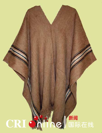 ????彭丘是用羊駝毛織成的披風,面料質(zhì)地十分細膩,胸口開V字領,形狀像長方形的毛毯,兩側(cè)的擺有黑白相間的傳統(tǒng)花邊。顏色采取深棕色,披在身上呈寬松的倒三角廓形,傳統(tǒng)花邊的點綴極具地域特色。
