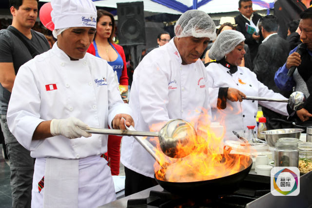 2015年9月17日,兩名廚師在秘魯美食創(chuàng)新大賽上進(jìn)行炒飯技能比拼。(新華社發(fā) 路易斯·卡馬喬攝)