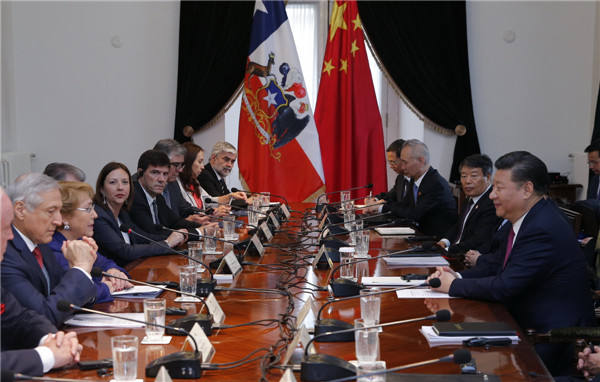 11月22日,國家主席習近平在圣地亞哥同智利總統(tǒng)巴切萊特舉行會談。(新華社記者 鞠鵬 攝)
