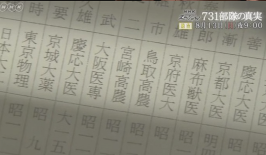 參加731部隊(duì)的機(jī)構(gòu)及人員名單(圖片來源:NHK視頻截圖)