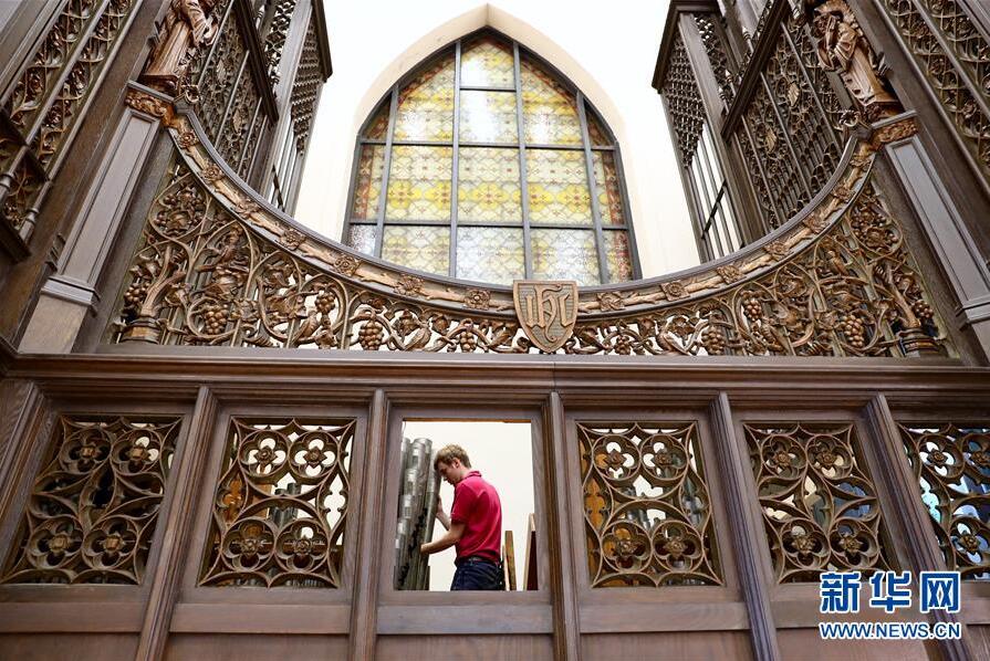 德國管風琴修理師弗朗茨·羅思在進行卡薩翁內部維修工作(10月23日攝)。 100年前,它誕生在美國波士頓,轟動一時,成為北美四大名琴之一。然而,歷史的變遷中,它一度傷痕累累,無法再發(fā)聲。新華社記者 姜克紅攝