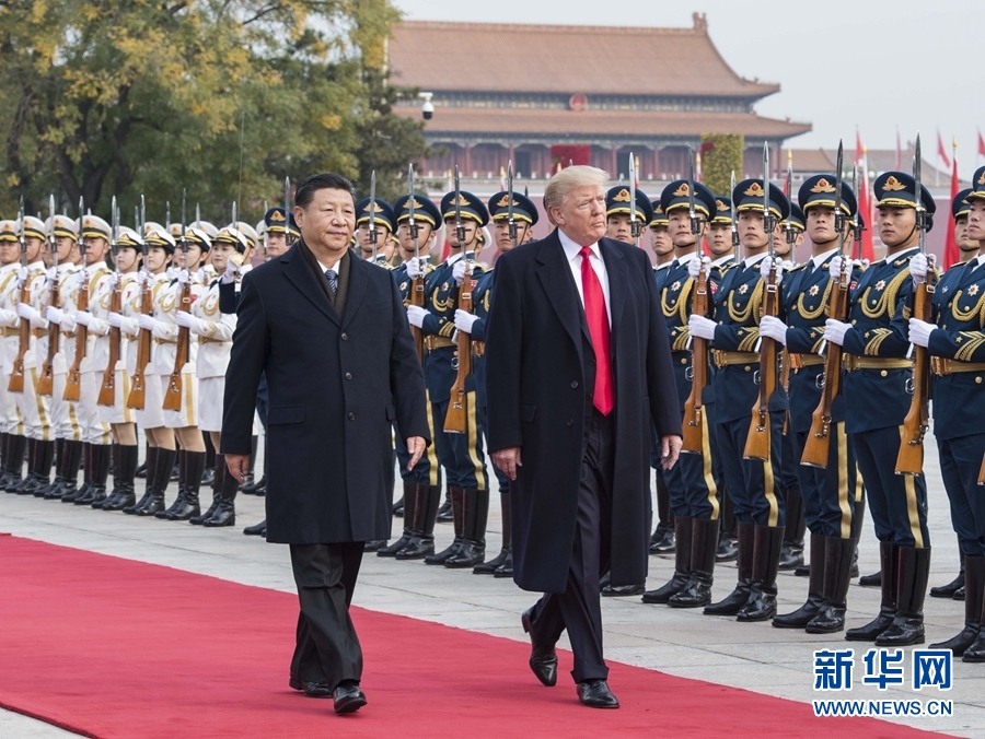 11月9日,國家主席習(xí)近平在北京人民大會(huì)堂東門外廣場舉行歡迎儀式,歡迎美利堅(jiān)合眾國總統(tǒng)唐納德·特朗普對(duì)中國進(jìn)行國事訪問。 新華社記者李濤 攝