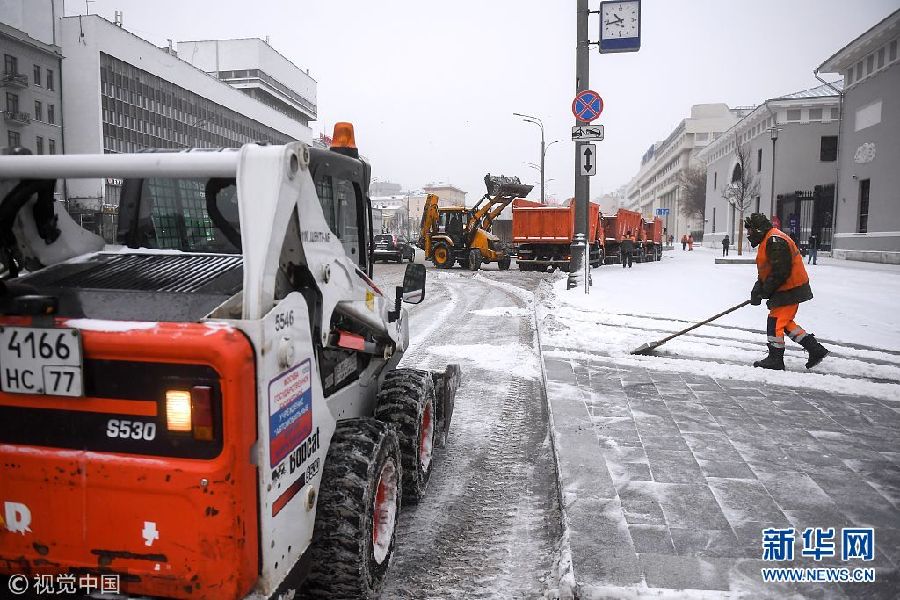 當?shù)貢r間1月20日,俄羅斯莫斯科,工作人員在清理街道上的積雪。 (圖片來源:視覺中國)