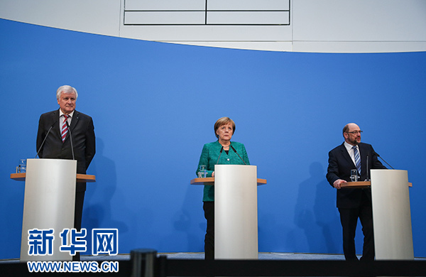 ??? 2月7日,在德國柏林的基民盟總部,德國總理、聯(lián)盟黨領導人默克爾(中),社會民主黨主席舒爾茨(右)和基社盟主席澤霍費爾出席新聞發(fā)布會。據(jù)德國媒體報道,德國聯(lián)盟黨(由基民盟和基社盟組成)和社會民主黨(社民黨)7日就聯(lián)合組閣協(xié)議達成一致。 新華社記者單宇琦攝