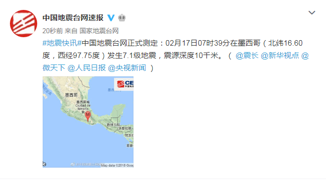 新華社快訊:中國地震臺(tái)網(wǎng)正式測(cè)定:2月17日7時(shí)39分,在墨西哥(北緯16.60度,西經(jīng)97.75度)發(fā)生7.1級(jí)地震,震源深度10公里。